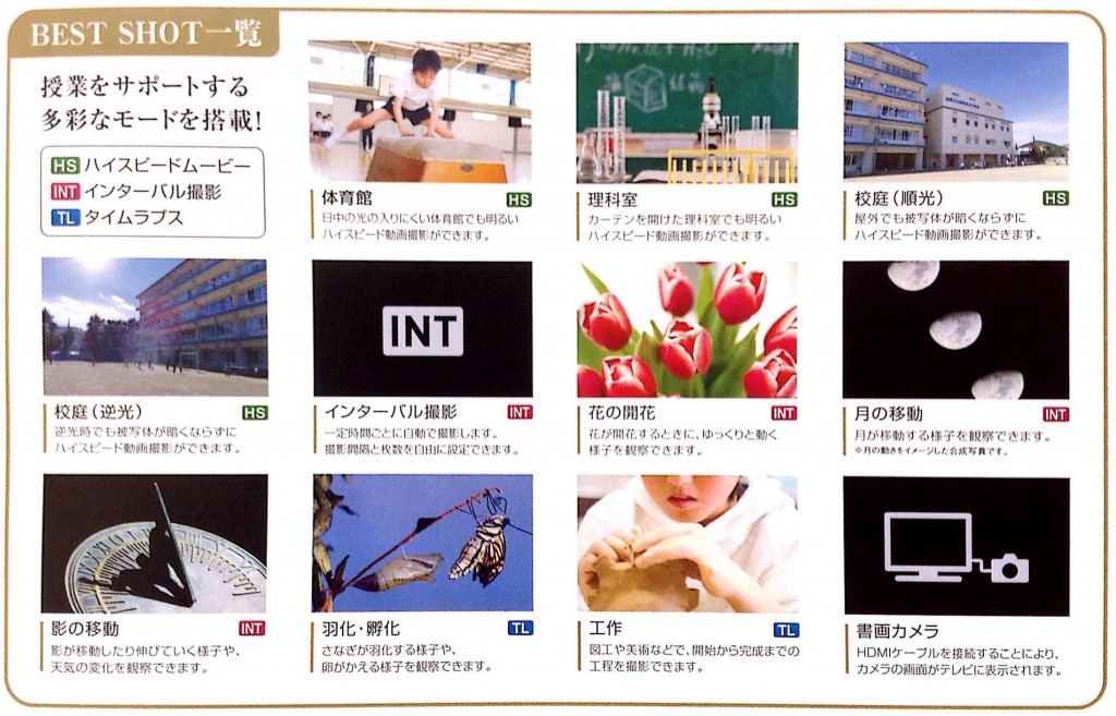 体育館・理科室・校庭・インターバル撮影・花の開花・月の移動撮影・影の移動撮影・工作工程の撮影・