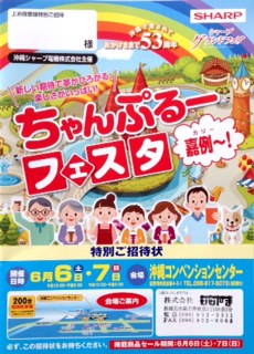 [イベント] 沖縄シャープ電機販売㈱ ちゃんぷるーフェスタ6月6・7日 タグ:グランドフェア, シャープ 沖縄シャープ電機株式会社主催 グランドフェア 2015年6月6日・7日に沖縄コンベンションセンターにて開催されます。 ご招待状の件については、弊社までお問合せ下さいませ。 投稿日:2015/05/23