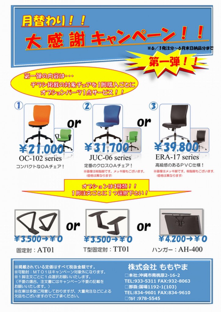オフィスチェア プラスワンキャンペーン!! タグ:オフィス, オフィス家具おすすめ, チェア, 椅子 弊社営業までお問合せ下さいませ。 6月のキャンペーンとして、 オフィスチェア プラスワンを実施いたします。 対象商品をご購入されましたお客様には、 もれなく ・・・ サークル肘 ・ T型肘 ・ ハンガーパーツ のいずれかお一つサービス致します。 この機会にご活用下さいませ。 投稿日:2015/06/02