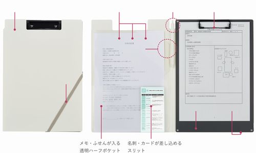 今回発売する「書類がすっきり分けられるクリップホルダー」は、A4書類を3つのポケットに仕分けできる3段ポケットのついたクリップホルダーです。立ちながらの作業でも片手で書類が出し入れしやすいようポケットの端を浮かせ、インデックスをめくれば奥の書類が取り出しやすいように設計されています。1枚目のポケットを透明にすることで、見開きで書類を並べて閲覧することが可能となり、見本を参照しながら用紙へ記入する作業がしやすくなります。また、全部材アルコール・次亜塩素酸での消毒が可能で、表紙は汚れが拭き取りやすいよう細かいシボ加工仕上げとなっています。個人情報の取り扱いに配慮した表紙止めのゴムバンド付き。カラーは清潔感のある、やさしい色合いでミントグリーン、クラシカルピンク、プレーンホワイトの3色を揃えました。