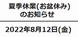 お盆休みのお知らせ タグ:お盆休み 平素はひとかたならぬご厚情にあずかり、心から御礼申し上げます。 当社では以下の期間をお盆休みとさせていただきます。 ご迷惑をおかけしますが、ご了承のほどよろしくお願いします。 夏季休業(お盆休み)期間:08月12日(金) 夏季休業(お盆休み)中に頂いたお問合せについては、 お盆休み期間終了後に順次回答させていただきます。 大変ご不便をおかけいたしますが、何卒ご理解の程お願い申し上げます。 投稿日:2022/07/16